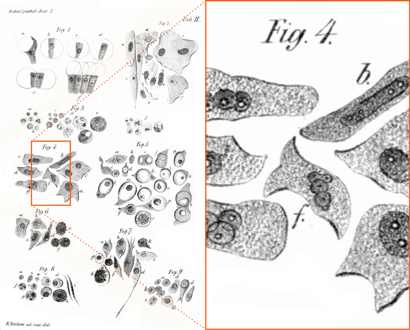 This drawing of different types of cells (left) illustrates the state of the art in 1847. Microscopes had low resolution; photographic analysis did not exist. What we call cytoplasm today was drawn as mysterious granules (see the enlargement on the right). Bechamp incorrectly believed that these stipples revealed the secret of life: life-giving microzymas.